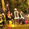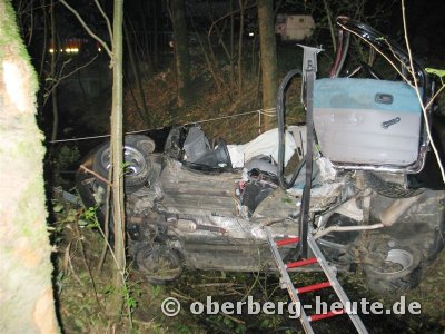 Gummersbach - Ausgangs einer Rechtskurve kam der PKW eines 19- jährigen Fahrers von der Straße ab, prallte nach einer Drehung um die Längsachse gegen einen Baum und landete anschließend im Bachlauf der Agger. Durch den Unfall wurde der 19-Jährige in seinem Auto eingeklemmt und musste durch die Feuerwehr befreit werden.