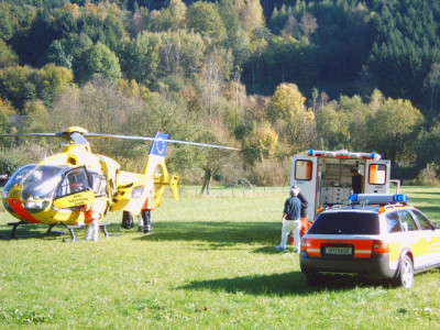 Der Rettungsleitstelle wurde lediglich eine Person mit stark verbrannten Händen in einer Telefonzelle gemeldet. Der unverzüglich eingetroffene Notarzt stellte jedoch erhebliche Verbrennungen am gesamten Körper des 40-Jährigen Gummersbachers fest. Nach ersten polizeilichen Ermittlungen kaufte der 40-jährige heute Vormittag Spiritus, den er sich an einem abgelegenen Platz über Kopf und Körper goss und dann anzündete. Anschließend sei er mit einem Fahrrad zur Telefonzelle gefahren, wo der den Zeugen aufgefallen war. Offenbar wollte er von dort aus Hilfe holen. Der Schwerverletzte wurde mit Rettungshubschrauber Christoph 25 in eine Spezialklinik gebracht. Es besteht Lebensgefahr. Die Polizei geht von einem Suizidversuch aus. (oh-18.10.2005 17:12 Fotos: Flying-Media)