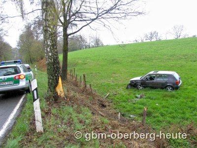 Nümbrecht - Totalschaden entstand an einem PKW, der auf der K 17, von Stockheim nach Elsenroth hinter einer Linkskurve nach rechts von der Fahrbahn abkam, gegen die Befestigung einer Hauszufahrt prallte und von dort wieder auf die Straße schleuderte. Der Fahrer ließ den Unfallwagen zurück und flüchtete.
