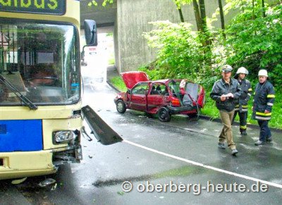 Sie musste von der Feuerwehr befreit werden, erlitt aber zum Glück nur leichte Verletzungen. An ihrem Pkw entstand Totalschaden, am Omnibus, der beim Ausweichmanöver gegen einen Lichtmasten geprallt war, entstand hoher Sachschaden. (oh-29.05.2006 17:18)