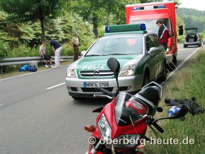 Gummersbach - Am 20.07.06, gegen 20:15 Uhr, befuhr ein 16-jähriger Kleinkraftradfahrer die Meinerzhagener Straße (L 323) nach Frömmersbach. Ausgangs einer Linkskurve leitete er plötzlich eine Vollbremsung ein, um auf der Straße zu wenden. Dabei kam es zum Zusammenstoß mit einem nachfolgenden 17-jährigen Kleinkraftradfahrer.