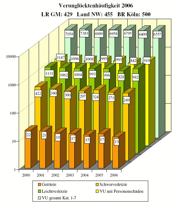 Landesweit ergibt sich daraus die 4.günstigste Häufigkeit aller Kreispolizeibehörden. Tödlich verunfallte ein Mitbürger über 65 Jahre, 2005 waren es fünf.