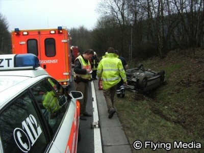 Der PKW war aus bislang ungeklärter Ursache auf den Grünstreifen gestraten, überschlug sich und landete schließlich auf dem Dach.