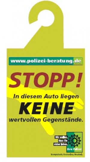 Nun rüttelt die Polizei mit einer bundesweiten Initiative Autofahrer wach. Hierzu gehört auch der „Anti-Klau-Anhänger“. Der Anhänger wird am Rückspiegel angebracht. Von außen signalisiert er einem potentiellen Dieb klar: Hier ist nichts zu holen. Auf der Innenseite findet der Fahrer eine Checkliste mit wichtigen Tipps, an die es zu denken gilt, bevor er das Auto verlässt.