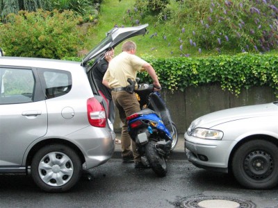 Gestern Nachmittag, gegen 15:40 Uhr, befuhr eine 57-jährige Autofahrerin aus Bergneustadt die Dümmlinghauser Straße aus Richtung Klosterstraße kommend in Richtung Innenstadt. Sie bemerkte zu spät, dass eine vorausfahrende Motorrollerfahrerin verkehrsbedingt abbremsen musste. Sie fuhr auf das Zweirad auf, wodurch die 18-jährige Fahrerin auf den vor ihr befindlichen PKW eines 62-jährigen Morsbachers geschoben wurde und auf die Fahrbahn stürzte. Die junge Frau erlitt leichte Verletzungen. Sie konnte nach ambulanter Behandlung wieder aus dem Krankenhaus entlassen werden. Es entstand hoher Sachschaden. (soh-17.07.2008 10:05)