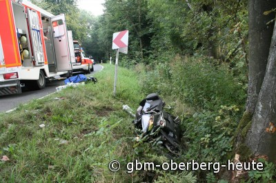 Waldbröl - (aktualisiert) Lebensgefährliche Verletzungen zog sich am späten Mittwochnachmittag ein 28-jähriger Kradfahrer auf der B 256 bei einem schweren Alleinunfall zu. Der junge Mann war von der Fahrbahn abgekommen und gegen einen Baum geprallt.