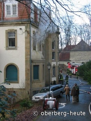 Gummersbach - Offene Flammen schlugen der Feuerwehr aus dem Flur der Jugendstil-Villa in Windhagen entgegen, die ehemals zur Firma Steinmüller gehörte. Das rund 1.400 m² große Gebäude war vollständig verqualmt. Die Eigentümer hatten den Brand selbst entdeckt.