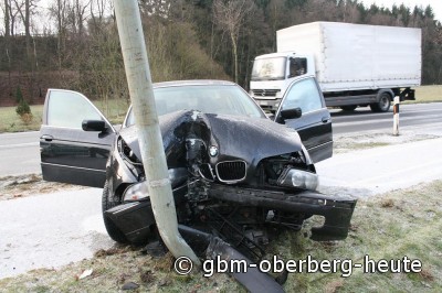 Gegen 8.55 Uhr kam ein 32-jähriger Pkw-Fahrer auf glatter Fahrbahn zwischen Berkenroth und Benroth von der Straße ab und stieß gegen einen Strommast. Die Unfallstelle liegt auf einer Geraden der B 478. Die 33-jährige Beifahrerin erlitt leichte Verletzungen, am Pkw entstand hoher Sachschaden.