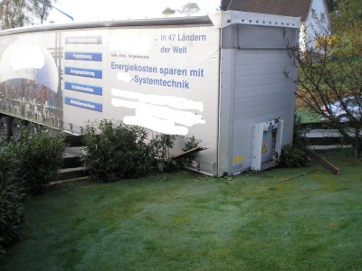 Der vordere Teil des Aufliegers war zunächst auf eine Asphaltfläche neben der Fahrbahn geprallt, die durch den Unfall stark beschädigt wurden. Auch das Pflaster der angrenzenden Zufahrt zu einem Grundstück wurde aufgerissen, eine Hecke und ein Zaun erheblich beschädigt. Etwa sechs bis acht Meter vor dem Haus kam der Auflieger zum Stehen.