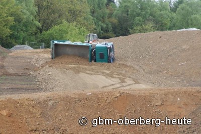 Reichshof - Beim Abladen von Erde geriet heute Vormittag ein Laster auf dem aufgeschütteten Erdreich der Deponie in Schneppenhurth ins Rutschen und kippte zur Seite. Der Fahrer wurde durch das Führerhaus geschleudert, er zog sich zum Glück nur leichte Verletzungen zu.