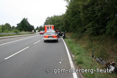 Am Sonntag befuhr ein 22 - jähriger Kradfahrer in einer Gruppe von Motorradfahrern, gegen 13.55 Uhr, die Landstraße 324 von Waldbröl nach Richtung Erblingen. Als der vorausfahrende Kradfahrer im Bereich einer lang gezogenen Linkskurve, unmittelbar vor der Ortschaft Erblingen, seine Geschwindigkeit reduzierte, bemerkte der 22- jährige dies zu spät, musste abrupt abbremsen, verlor dabei die Kontrolle über sein Fahrzeug und kam im Straßengraben zu Fall. Dabei zog er sich schwere Verletzungen zu. Er wurde nach notärztlicher Versorgung am Unfallort mit dem RTW in ein Krankenhaus gebracht. Am Krad entstand erheblicher Sachschaden. (red.-10.08.2009 21:02)