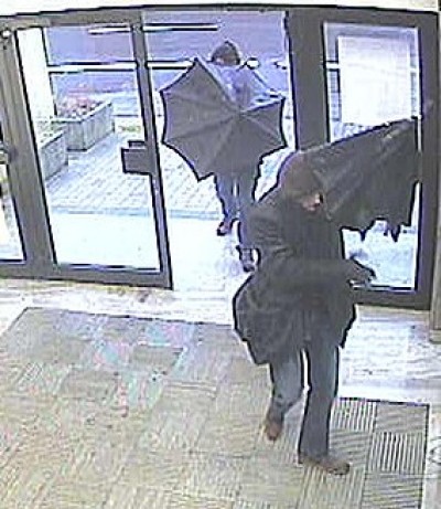 Bekleidet waren sie mit dunklen Jacken, darunter braune/dunkle Kapuzenjacken, Jeanshose und braune Schuhe. Beide Personen führten jeweils einen schwarzen Schirm mit, den sie auf der Flucht aufspannten. Einer der Täter hatte eine schwarze Umhängetasche über der Schulter.