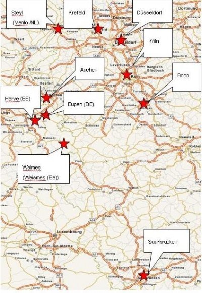 Die bis jetzt bekannt gewordenen Tatorte liegen in Aachen, Bonn, Köln, Düsseldorf, Krefeld, Saarbrücken, Steyl bei Venlo und im Raum Eupen (Eupen, Raeren, Weismes, Herve).