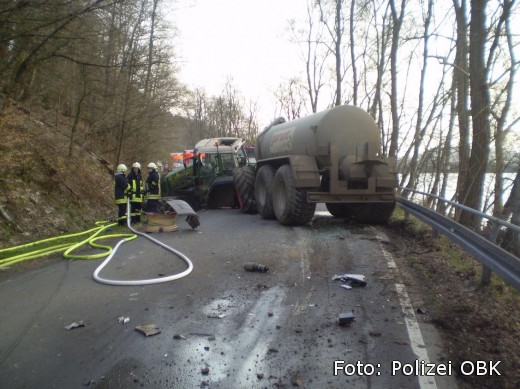 Die mit Getrieböl verschmutzte Fahrbahn wurde durch eine Fachfirma gereinigt. Die K5 war während der Unfallaufnahme, Fz-Bergung und Fahrbahnreinigung für ca. sechs Stunden voll gesperrt. Es entstand hoher Sachschaden von rund 120.000 Euro. (red.-15.04.2010 08:26) (aktualisiert.-15.04.2010 09:44)