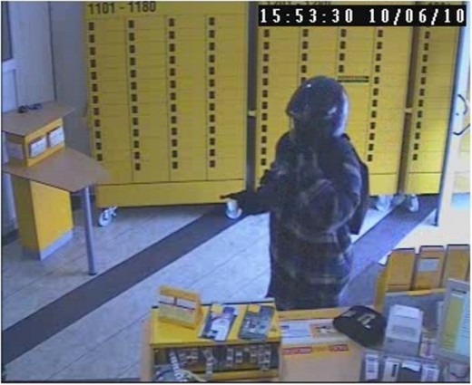 Am Donnerstag, 10.06.2010 kurz vor 16:00 Uhr, betrat der Einzeltäter die Freudenberger Filiale der Deutschen Post AG und forderte unter Vorhalt einer Schusswaffe Bargeld. Nach der Tat flüchtete der Täter mit dem erbeuteten Bargeld sowie einer größeren Menge Briefmarken zunächst zu Fuß aus der Postfiliale und besetzte dann ein neben der dortigen Apotheke stehendes Motorrad und fuhr damit mit hoher Geschwindigkeit in Richtung Büschergrund bzw. Wenden davon. Das Siegener Kriminalkommissariat 21 veröffentlicht nun Fotos des mit einem Motorradhelm und einer Unterziehhaube maskierten Täters. Die Fotos zeigen den Täter in der Postfiliale. Sein Äußeres weist dabei einige markante Merkmale auf, die Zeugen - vor oder nach dem Überfall - aufgefallen sein könnten.