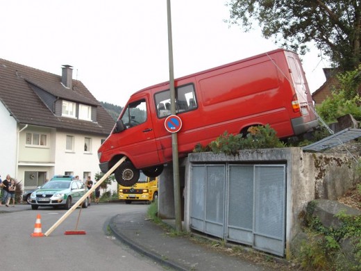 Gummersbach - Weil der Fahrer eines Kleintransporters am Freitag gegen 20:30 Uhr sein Fahrzeug „In der Mühlhelle“ in Gummersbach-Derschlag nicht ordnungsgemäß sicherte, kam der Wagen auf dem abschüssigen Grundstück ins Rollen, durchbrach einen Zaun und blieb "wackelnd" in luftiger Höhe hängen.