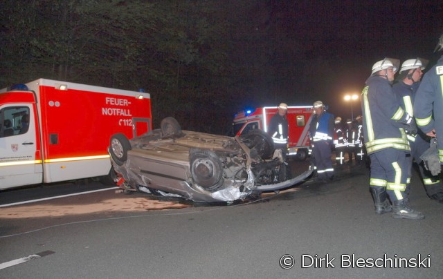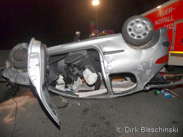 Reichshof - Gegen 23:45 Uhr ereignete sich am Samstagabend aus bislang ungeklärter Ursache ein Verkehrsunfall auf der BAB 4, kurz vor dem Olper Südkreuz an der AS Eckenhagen. Ein PKW hatte sich mehrfach überschlagen und landete schließlich auf dem Dach. Zwei Personen wurden verletzt.