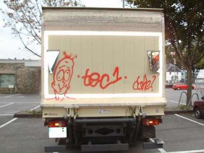 Engelskirchen - In der Nacht von Montag (29.08.) auf Dienstag beschmierten unbekannte Täter die Gebäuderückfront eines Verbrauchermarktes in der Hüttenstraße mit Graffitis. Auch ein auf dem dortigen Parkplatzgelände abgestellter Lkw fiel den Vandalen zum Opfer. Die Schriftzüge wurden mit roter Sprühfarbe aufgebracht. Ihnen sind die Worte "tec1, doke!, doke" zu entnehmen. Die Laderampe des Lkw ziert zudem ein lachendes Gesicht.