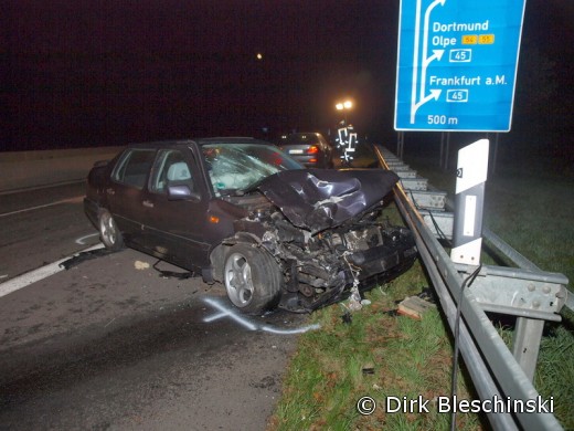 Ein 26jähriger Fahrzeugführer aus Lüdenscheid befuhr mit seinem Pkw den rechten Fahrstreifen der BAB 4 in Richtung Olpe. Eine nachfolgende 28-jährige Aachenerin unterschätzte die Geschwindigkeit und fuhr auf diesen auf. Hierbei drehte sich der Lüdenscheider mit seinem Pkw mehrfach um die eigene Achse. Ein 46-jähriger Gummersbacher fuhr mit seinem Pkw in die Unfallstelle.