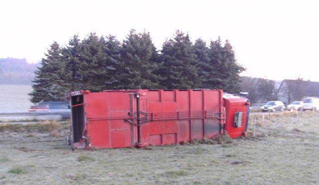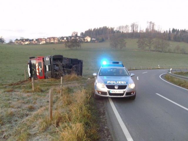 Lindlar - Der 33-jährige Fahrer und sein 25-jähriger Beifahrer eines Lkw wurden schwer verletzt als das Fahrzeug aus noch ungeklärter Ursache von der Schwarzenbachstraße abkam und umkippte. Dabei beschädigte er einen Weidezaun und kippte auf die rechte Fahrzeugseite.
