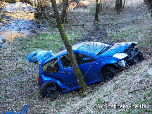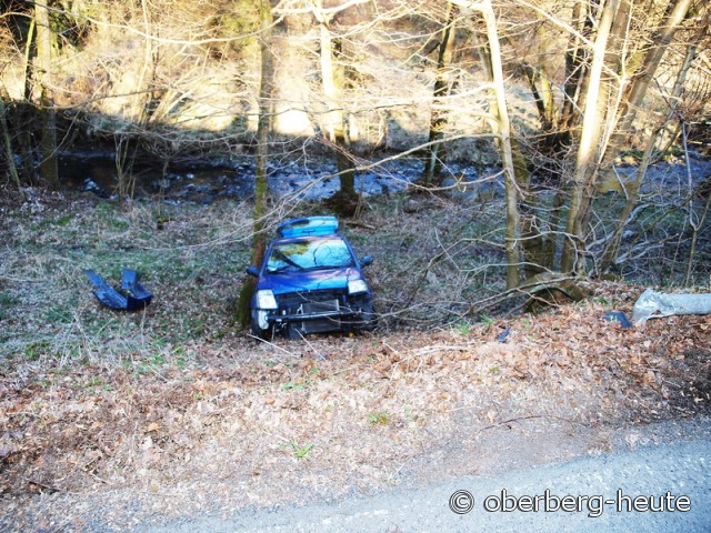 Wiehl - Aus bislang nicht abschließend geklärter Ursache hat am späten Sonntagnachmittag (25.03.) ein 20-jähriger Mann aus Wiehl die Kontrolle über sein Auto verloren und sich dabei leicht verletzt. Um 16:50 Uhr war er auf der Alpetalstraße (L 341) aus Richtung Hunsheim kommend unterwegs, als er auf der kurvenreichen Strecke vor der Ortschaft Alpe mit seinem Fahrzeug ins Schleudern kam und eine vier Meter tiefe Böschung hinabrutschte. Sein Auto kam knapp vor dem Alpebach zwischen zwei Bäumen zum Stillstand und wurde dabei erheblich beschädigt. Der 20-Jährige klagte nach dem Vorfall über Kreislaufbeschwerden und musste von einer Rettungswagenbesatzung vor Ort versorgt werden, ehe er nach Hause gebracht werden konnte. (red.-26.03.2012 15:49)