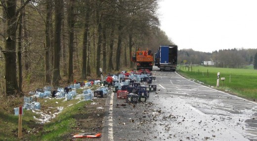 Altenkirchen-Reiferscheidt - Am Dienstagvormittag befuhr ein 28-jähriger Lkw-Fahrer die B 256 von Altenkirchen in Richtung Flammersfeld. Die Ladung des Aufliegers bestand aus etwa 300 Bier- und Wasserkästen. Als in Höhe der Ortschaft Reiferscheid ein Reh die Straße überquerte, wollte der LKW-Fahrer ausweichen. Dabei geriet der Lastzug ins Schlingern, die Ladung kippte nach links und durchbrach die Plane. Die zerborstenen Bierflaschen und Kästen verteilten sich großflächig über die gesamte Fahrbahn. Der Fahrer blieb unverletzt. Die Polizei schätzt den Schaden an der Ladung auf etwa 8.000 Euro und den Sachschaden am LKW-Auflieger mit 10.000 Euro. am Lkw-Auflieger. (red.-18.04.2012 13:27)
