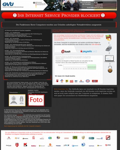 Wieder ist eine neue Variante von Schadsoftware, eine so genannte Ransomware, im Umlauf, die Computer infiziert und sperrt. Eine Nutzung des Rechners ist nicht mehr möglich. Dabei wird durch die Schadsoftware ein sogenanntes Popup-Fenster mit den Logos des Bundesamtes für Sicherheit in der Informationstechnik (BSI) und der Gesellschaft für Verfolgung von Urheberrechtsverletzungen (GVU) eingeblendet. Darin wird dem Nutzer unterstellt, dass der Rechner im Zusammenhang mit der Verbreitung kinderpornografischen Materials, bei terroristischen Aktionen, Urheberrechtsverletzungen oder anderen Straftaten genutzt worden sei.
