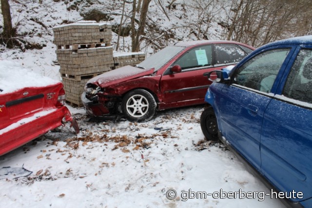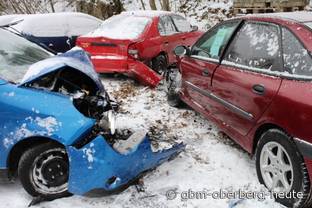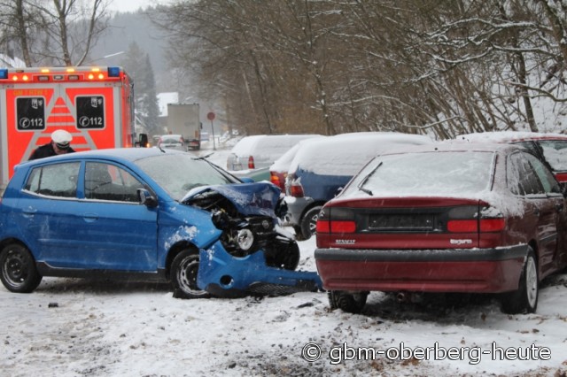 Ein weiterer Unfall mit zwei Leichtverletzten ereignete sich um 7:50 Uhr in Morsbach-Volperhausen. Eine 39-jährige Pkw-Fahrerin befuhr die Wissener Straße aus Richtung Morsbach kommend in Richtung Wissen. Im Bereich der Ortslage Volperhausen überholte sie auf teilweise mit Schneematsch bedeckter Fahrbahn ein vor ihr fahrendes Fahrzeug. Beim Wiedereinscheren geriet der Pkw ins Schleudern und kam nach rechts von der Fahrbahn ab. Hier stieß der Pkw mit der Fahrzeugfront gegen zwei geparkte Fahrzeuge und schob diese in ein weiteres stehendes Auto.