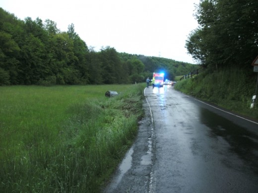 Wiehl - Heute Morgen wurde ein 34-jähriger Reichshofer auf der Landstraße 133 in Wiehl-Dreisbach bei einem Alleinunfall leicht verletzt. Der Renault-Fahrer war um 7 Uhr in Richtung Dreisbach unterwegs als er in einer Linkskurve aus bislang ungeklärter Ursache die Kontrolle über sein Fahrzeug verlor. Nachdem das Heck ausgebrochen war, kam er nach links von der regennassen Fahrbahn ab. Der Renault überschlug sich und kam auf einer Wiese, etwa drei Meter unterhalb der Straße, zum Stehen. Das total beschädigte Fahrzeug musste abgeschleppt werden. (red.-23.05.2013 14:48)