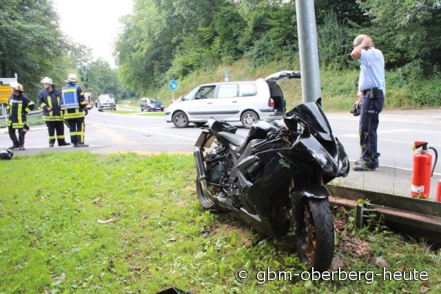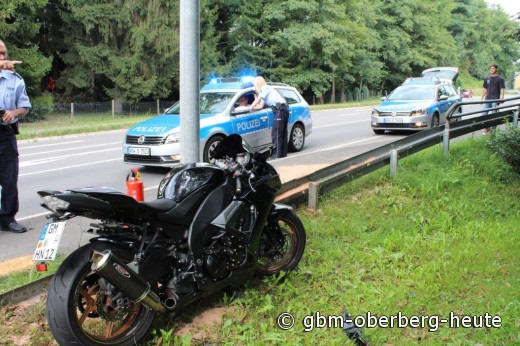 Waldbröl - Die Fahrt eines 39-jährigen Motorradfahrers endete gestern Nachmittag im Krankenhaus. Ein 33-jähriger Renaultfahrer wollte um 16:15 Uhr an der Einmündung Bladersbacher Straße von der Brölstraße nach links abbiegen. Der 39-jährige Kradfahrer aus Waldbröl kam ihm auf der Bröstraße entgegen. Er leitete eine Vollbremsung ein, um eine Kollision zu vermeiden und stürzte. Das Motorrad rutschte über die Einmündung hinweg in den Seitenstreifen. Der Kradfahrer geriet unter die Front des Autos. Er zog sich schwere aber keine lebensgefährlichen Verletzungen zu.