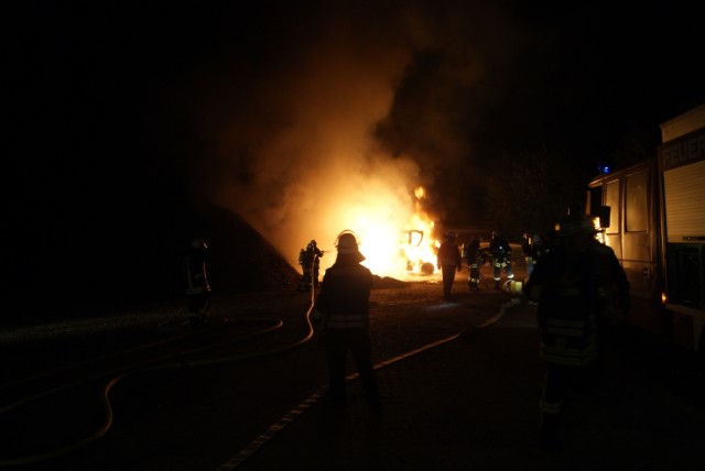 Wipperfürth - Die Löschgruppen Egen und Kreuzberg sowie der Löschzug Wipperfürth wurden in der Nacht von Montag auf Dienstag zu einem Brand in einem holzverarbeitenten Betrieb in Wipperfürth-Kupferberg gerufen. Ein großer Feuerschein ließ die Kräfte auf der Anfahrt Böses erahnen, zumal ein Zeuge der Leitstelle offenbar einen möglichen Lagerhallenbrand gemeldet hatte. Vor Ort stellte sich jedoch heraus, dass lediglich ein Radlader in Vollbrand stand, der jedoch unmittelbar an der Lagerhalle parkte.