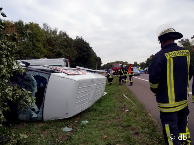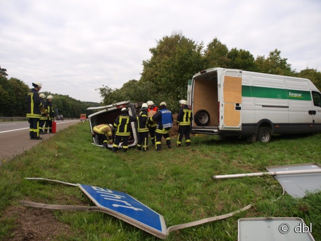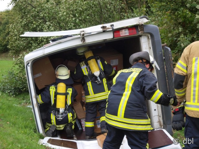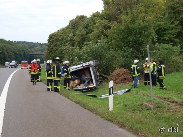 Reichshof - Bei einem Abbiegevorgang von der A4 zur Ausfahrt Eckenhagen kam es heute Morgen zu einem Verkehrsunfall, bei dem der 41-jährige Fahrer aus Morsbach verletzt wurde. Der Kleinlaster war geradeaus auf den Grünstreifen gefahren, gegen ein Verkehrsschild und einen Baum geprallt und dann zur Seite gekippt. Die Feuerwehr konnte den eingeklemmten Fahrer schnell aus seinem Führerhaus befreien. Die Ladung wurde von der Feuerwehr unter Atemschutz in ein anderes Fahrzeug umgeladen, da auf der Ladeliste eine Batterie vermerkt war, die möglicherweise beschädigt war.