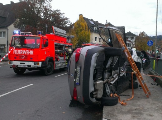 Engelskirchen - Beim Abbiegen geriet ein 73-jähriger Pkw-Fahrer an der Einmündung zur B 55 auf der Leppestraße nach rechts von der Fahrbahn ab und prallte gegen ein Brückengeländer. Danach kippte der Pkw auf die linke Seite und stieß dabei gegen die Beifahrerseite eines 19-jährigen Pkw-Fahrers, der sich auf der Fahrbahn der B 55 (Märkische Straße) in Richtung Gummersbach befand. Der Fahrer des umgekippten Pkw sowie seine 75-jährige Beifahrerin konnten sich nicht selbständig aus dem Fahrzeug befreien. Mehrere Ersthelfer stützten den Pkw ab, damit dieser nicht aufs Dach kippte.