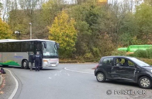 Gummersbach - Eine verletzte Person und hoher Sachschaden ist die Bilanz eines Verkehrsunfalls, der sich heute gegen 11 Uhr in Gummersbach am Kreisverkehr Wilhelm-Breckow-Allee / Albert-Schweitzer-Platz ereignete. Der 49-jährige Fahrer eines Kraftomnibus musste kurz vor dem Kreisverkehr einem herannahenden Rettungswagen Platz machen, der mit Blaulicht und Martinshorn unterwegs war. Nachdem der Einsatzwagen den Bus passiert hatte, fuhr der Fahrer in den Kreisverkehr ein. Dabei kam es zum Zusammenstoß mit dem Auto einer 49-Jährigen, die sich bereits im Kreisverkehr befand.
