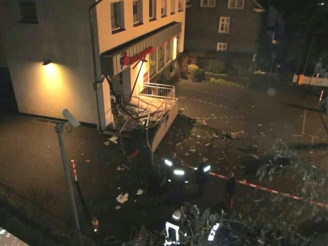 Reichshof - aktualisiert - Gegen 2.30 Uhr, kam es heute Morgen in einer Sparkassenfiliale auf der Hauptstraße in Reichshof-Eckenhagen zu einer Explosion. Nach ersten Erkenntnissen wurde die Detonation von bislang unbekannten Tätern verursacht, die auf diese Weise versuchten, den Geldautomaten zu öffnen; ob die Täter tatsächlich Bargeld erbeutet haben, ist zur Zeit noch nicht bekannt. Ermittlungen der Polizei ergaben, dass vermutlich vier bis fünf Tatverdächtige unmittelbar nach Tatausführung mit einem dunkeln BMW 1er vom Tatort flüchteten. Ein weiteres Fahrzeug, ein silberfarbener VW Jetta, der ebenfalls als mutmaßliches Täterfahrzeug in Frage kommt, wurde auf einem Parkplatz, etwa 200 Meter vom Tatort entfernt sichergestellt.