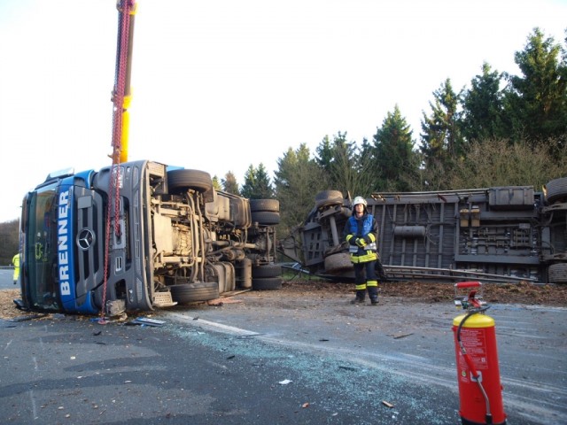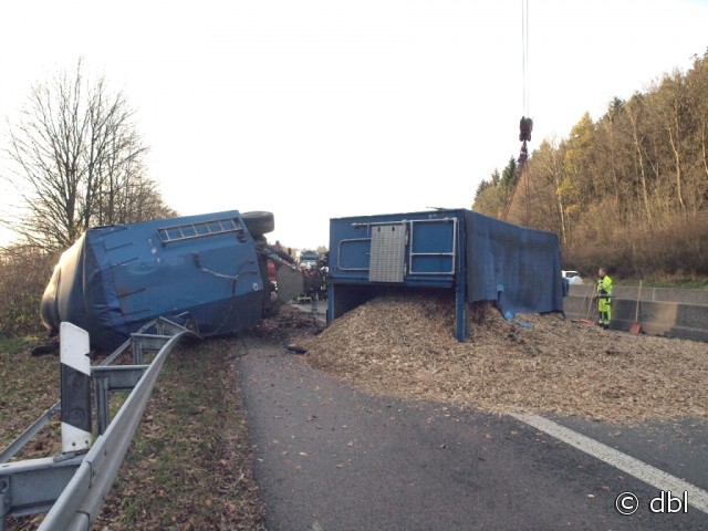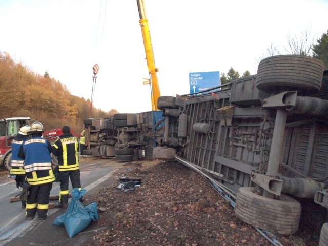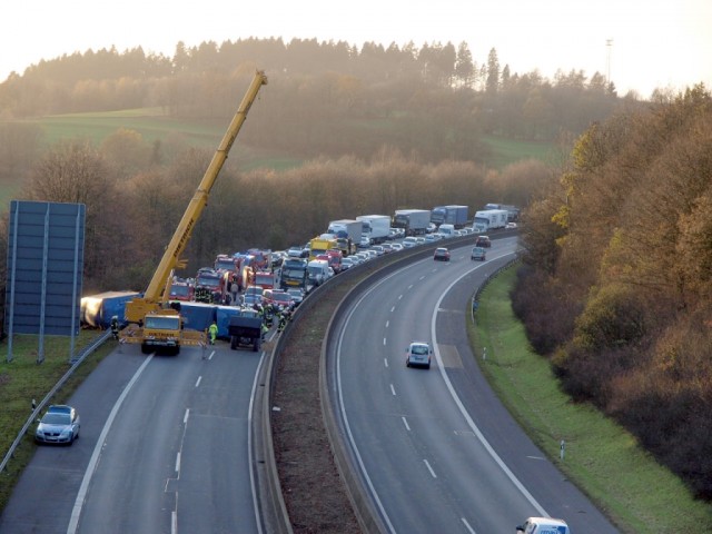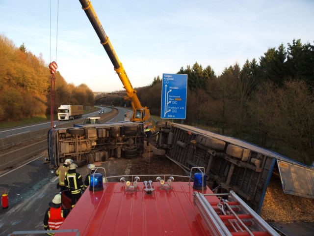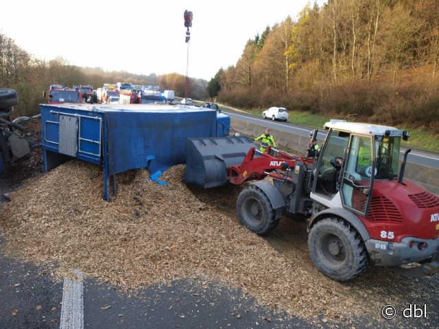 Reichshof - Seit kurz nach 14 Uhr ist die A4 Richtung Olpe zwischen Reichshof-Eckenhagen und dem Autobahnkreuz Olpe-Süd am Montagmittag von der Polizei voll gesperrt worden. Ein mit Holzhackschnitzeln beladener Sattelzug ist aus bislang ungeklärter Ursache umgekippt und liegt quer auf der Fahrbahn. Gegen 17:00 Uhr rückte ein Spezialunternehmen aus Koblenz an, um den verunglückten Sattelzug aufzurichten, damit er abgeschleppt werden kann. Die komplizierte Bergung dauert vermutlich bis 21 Uhr an. Autofahrer, die auf diesem Streckenabschnitt der A4 in den Stau geraten sind, stehen vor einer großen Geduldsprobe.