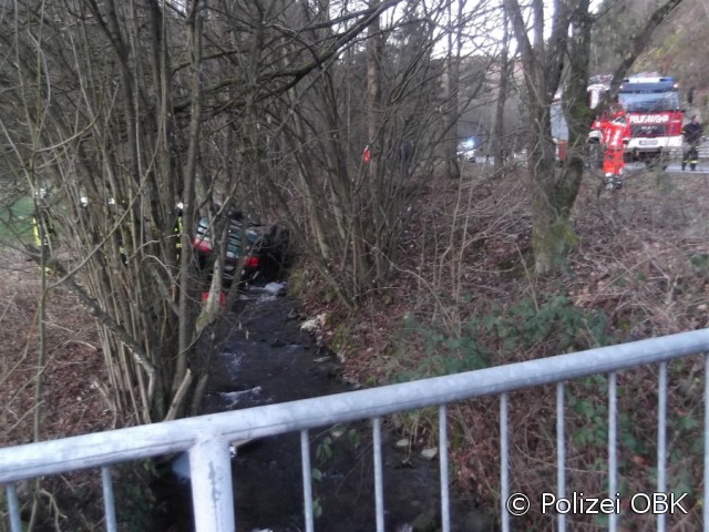 Marienheide - Obwohl der 35-jährige Fahrer am Sonntagnachmittag mit leichten Verletzungen aus seinem Auto aussteigen konnte, so nahm der recht spektakuläre Alleinunfall doch nicht nur ein glückliches Ende. Der Fahrer musste seinen Führerschein abgeben und an seinem PKW entstand Totalschaden. Der 35-jährige Marienheider hatte auf der K 46 in Höhe Siepen, in einer langgezogenen Linkskurve, die rechte Schutzplanke touchiert. Danach verlor er die Kontrolle über sein Fahrzeug, kam ins Schleudern, rutschte quer über Fahrbahn, Gehweg, Grünfläche und anschließend eine Böschung hinab. Sein Auto landete kopfüber im Bach.