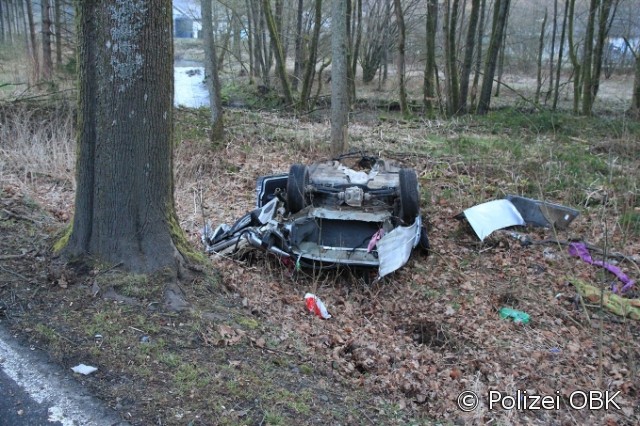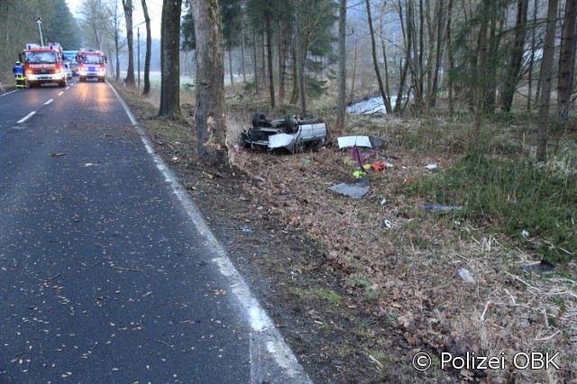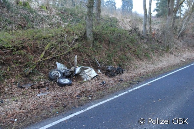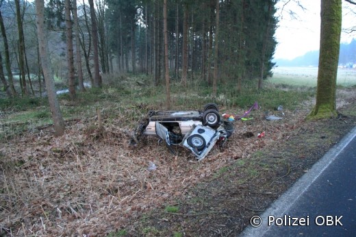 Hierbei geriet er ins Schleudern, verlor die Kontrolle über sein Auto und kam nach rechts von der Fahrbahn ab. Er touchierte dabei mit der rechten Fahrzeugseite einen Baum, wodurch der Pkw aber nicht die eingeschlagene Fahrspur verließ. Nach etwa 20 Metern prallte der Wagen dann mit der rechten Fahrzeugfront gegen einen weiteren Baum. Durch diesen Zusammenstoß wurde der gesamte vordere Achsbereich und der Motorblock abgerissen und das Fahrzeug herumgeschleudert. Achse und Motorblock schleuderten in den linksseitigen Straßengraben, während der Rest des Pkw nach weiteren 20 Metern nochmals gegen einen Baum prallte und schlussendlich auf dem Dach liegend, in einem Waldstück neben der Fahrbahn zum Stillstand kam. Der Fahrer wurde schwer verletzt, es entstand ein Schaden in Höhe von etwa 5.000 Euro. (red.-05.03.2014 16:20)