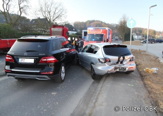 Marienheide - Zu einer Kettenreaktion, an der vier Verkehrsteilnehmer beteiligt waren, kam es heute Morgen auf der Gummersbacher Straße in Kalsbach. Ein 55-jähriger Daimler-Fahrer bog um 7:48 Uhr von der Wiesenstraße nach rechts auf die Gummersbacher Straße ab. Als er auf der dortigen Fußgängerinsel eine 56-jährige Fußgängerin sah, bremste er, um der Frau das Überqueren der Gummersbacher Straße zu ermöglichen. Doch dann kam alles anders.