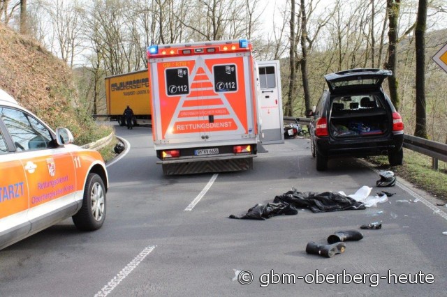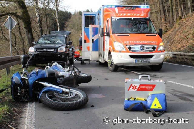 Morsbach - aktualisiert - In einer unübersichtlichen Rechtskurve verlor am Mittwochnachmittag ein 41-jähriger Kradfahrer, in Höhe der Ortslage Böcklingen, die Kontrolle über sein Fahrzeug und stürzte. Der Motorradfahrer aus Wiehl rutschte mit seiner BMW über den Asphalt und geriet auf die Gegenfahrbahn. Dort kollidierte er mit dem PKW Kia einer 47-jährigen Fahrerin aus Brüchermühle, die in entgegengesetzter Richtung unterwegs war.