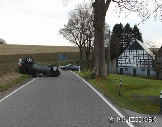 Radevormwald - Pkw gegen Baum, lautete die erste Meldung, die die Polizeileitstelle Oberberg gestern um 16 Uhr erreichte. Ein 61-jähriger Radevormwalder war auf der L 81 aus bislang ungeklärter Ursache nach rechts von der Fahrbahn abgekommen und auf den Grünstreifen geraten. Dort kollidierte das Fahrzeug frontal mit einer massiven Eiche, prallte von dem Baum ab und landete schließlich fünf Meter weiter auf dem Dach.
