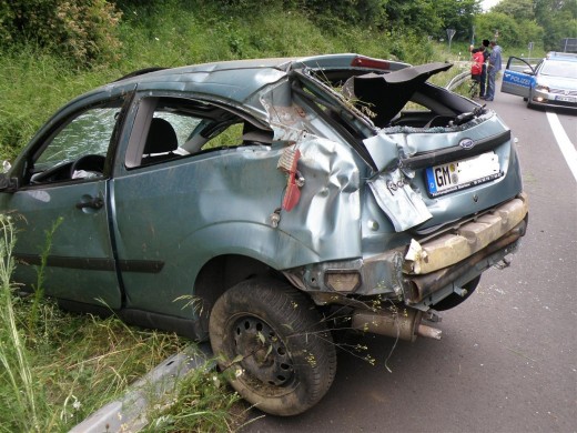 Foto: Polizei OBKReichshof - Zwischen Sengelbusch und Erdingen kam es am Montagnachmittag zu einem Verkehrsunfall, bei dem eine Person leicht verletzt wurde. Ein 20-jähriger Peugeotfahrer fuhr kurz vor 17 Uhr aus Richtung Rölefelder Straße kommend in Richtung Einmündung B 256. Als er an nach links in Richtung Erdingen abbog, kam es zu einem Beinahezusammenstoß mit dem Fahrzeug einer 20-Jährigen. Diese fuhr auf der B 256 aus Erdingen kommend in Richtung Sengelbusch. Um einen Zusammenstoß zu vermeiden lenkte sie nach rechts, kam dabei von der Fahrbahn ab und überschlug sich mehrfach. Nach etwa 40 Metern kam ihr Fahrzeug an den dortigen Leitplanken zum Stehen. An ihrem Pkw entstand Totalschaden; ermusste angeschleppt werden. Die 20-Jährige verletzte sich leicht und musste mit dem Rettungswagen ins Krankenhaus. (red.-18.06.2014 10:16)