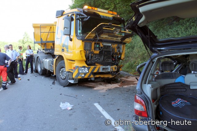 Um 9:40 Uhr befuhr die Frau aus Windeck die L 339 aus Grötzenberg kommend in Richtung Winterborn. In einer langgezogenen Rechtskurve zwischen den Ortschaften Grötzenberg und Winterborn geriet sie auf die Fahrspur des Gegenverkehrs. Dort kam ihr der 62-jährige Fahrer eines Sattelzugs entgegen. Einen Frontalzusammenstoß konnte er nicht mehr verhindern. Durch die Wucht