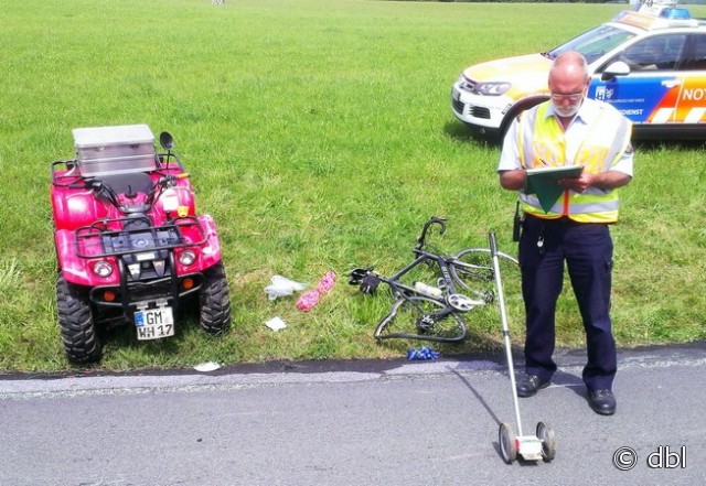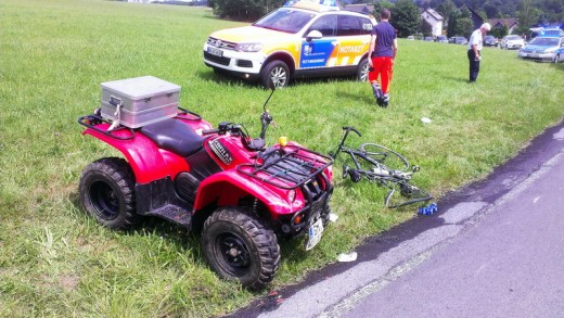 Reichshof - Schwere Verletzungen zog sich ein 45-jähriger Fahrradfahrer zu, der von einem nachfolgenden Quad angefahren wurde, das mit zwei Personen besetzt war. Durch den Aufprall wurde der 45-Jährige von seinem Rad gestoßen und auf die Fahrbahn geschleudert, auf der er bis auf eine angrenzende Wiese rutschte. Das Quad überschlug sich, und der 33-jährige Fahrer sowie seine 35-jährige Mitfahrerin wurden ebenfalls von ihrem Fahrzeug geschleudert und verletzt.