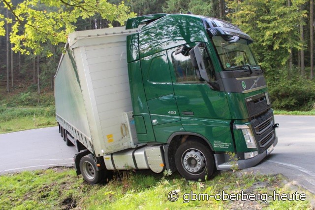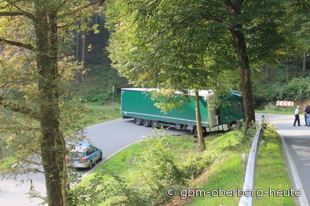 Dennoch endete seine Fahrt ebenso vor dem quer über die gesamte Fahrbahn stehenden Sattelzug, wie für die nachfolgenden Autos, die sich um die erneut aufgestellten Verkehrshütchen herum geschlängelt hatten. Sie mussten allesamt umkehren. Die Nachhilfe über Sinn und Zweck von Straßensperren dürfte einen LKW-Fahrer, der die Pylonen ebenfalls ignoriert hatte und der auf der engen und kurvenreichen Strecke nicht wenden konnte, völlig aus dem Zeitplan gebracht haben. Die Vollsperrung wurde erst gegen 12 Uhr aufgehoben, nachdem der Sattelzug mit Hilfe eines Unimogs wieder Teer unter allen Rädern hatte. (oh-09.09.2014 12:24)