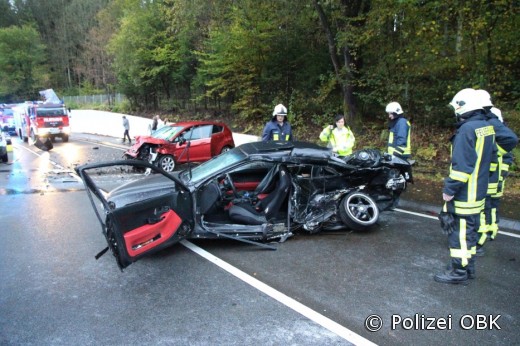 An beiden Fahrzeugen entstand Totalschaden. Durch die Wucht des Aufpralls war der Pkw der 34-Jährigen so stark beschädigt, dass ein Kran angefordert werden musste, um den Wagen auf den Abschleppwagen zu heben. Die Feuerwehr erschien vor Ort und beseitigte ausgelaufene Betriebsstoffe. Die B 256 war für die Zeit der Unfallaufnahme bis 10:20 Uhr komplett gesperrt. (red.-09.10.2014 13:47)