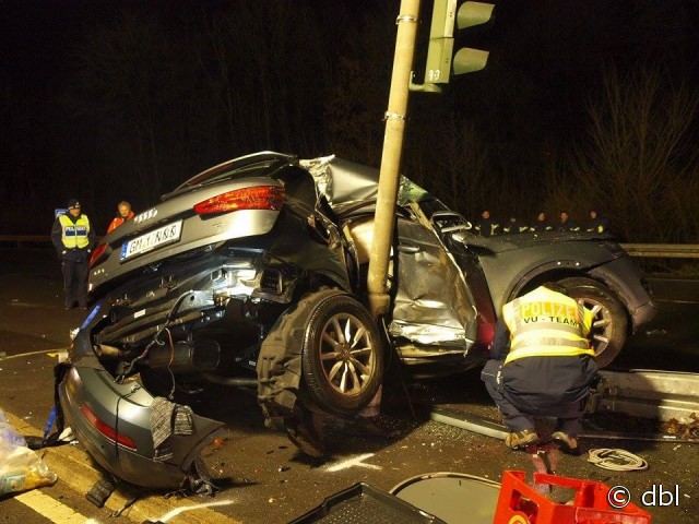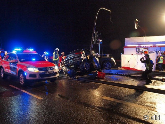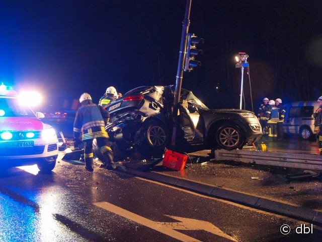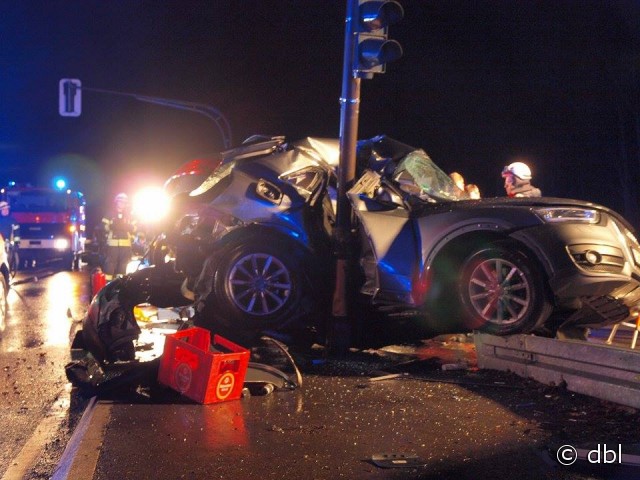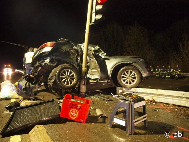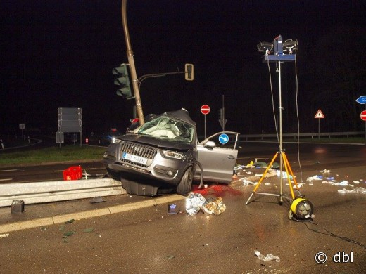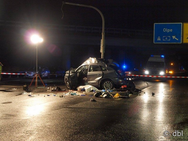 Wiehl - aktualisiert - Bei einem schweren Verkehrsunfall ist am auf der B 56 bei Wiehl ein Autofahrer (31) ums Leben gekommen. Sein Beifahrer (20) wurde lebensgefährlich verletzt. Der 31-Jährige befuhr kurz vor 21 Uhr mit seinem Audi Q 3 die B 56 von Gummersbach kommend in Richtung Wiehl. In Höhe der Anschlussstelle zur BAB 4 verlor der Fahrer die Kontrolle über sein Fahrzeug. Der SUV schleuderte nach links und prallte mit der rechten Fahrzeugseite gegen einen am Mittelstreifen stehenden Ampelmast.