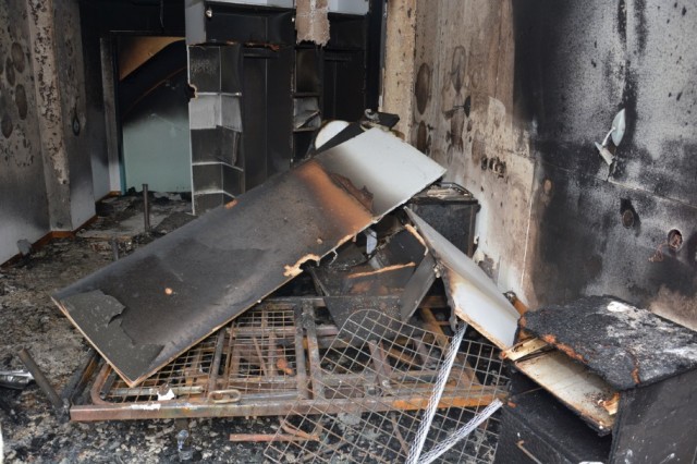 | Durch Feuer zerstörtes Patientenzimmer in der Klinik Marienheide (Foto: Klinikum Oberberg) |