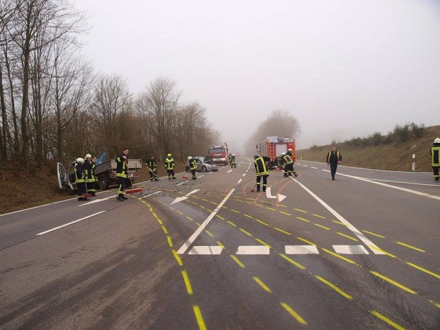 Marienheide - Am heutigen Morgen kam es in Marienheide- Holzwipper zu einem folgenschweren Verkehrsunfall. Zwei Personen wurden dabei schwer verletzt; die vierspurige Landstraße glich einem Trümmerfeld. Um 7:10 Uhr befuhr ein 29-jähriger Pkw-Fahrer aus Finnentrop die K45 in Richtung Einmündung L 306. Er beabsichtigte nach links auf die L 306 abzubiegen, um seine Fahrt in Richtung Meinerzhagen fortzusetzen. Zur gleichen Zeit befuhr der 33-jährige Fahrer eines Kleintransporters die vorfahrtsberechtigte L 306 aus Richtung Flughafen kommend in Richtung Holzwipper. Im Einmündungsbereich kam es zum Zusammenstoß der beiden Fahrzeuge. Durch die Wucht des Aufpralls wurde der Kleintransporter in den Straßengraben geschleudert. Der Pkw des 29-Jährigen drehte sich und kam im Gegenverkehr zum Stehen. Die Feuerwehr erschien vor Ort und führte bei dem eingeklemmten 29-Jährigen eine "Crashrettung" durch. Er musste mit lebensgefährlichen Verletzungen in ein Krankenhaus gebracht werden. Ein weiterer Rettungswagen brachte den schwerverletzten 33-jährigen Fahrer aus Meinerzhagen zur weiteren Behandlung in ein Krankenhaus. An beiden Fahrzeugen entstand Totalschaden; sie mussten abgeschleppt werden. Die vierspurige Landstraße war für die Dauer der Unfallaufnahme und der anschließenden Aufräumarbeiten bis 10:30 Uhr komplett gesperrt. (red.-08.04.2015 13:13)
