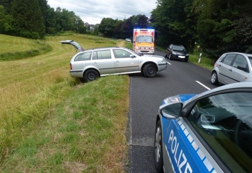 Reichshof - Drei leicht verletzte Fahrzeuginsassen forderte ein Verkehrsunfall auf der L 341 in Reichshof - Hunsheim. Eine 38-jährige Pkw-Fahrerin aus Wiehl, war am Mittwochnachmittag auf der Hunsheimer Straße (L 341) ausgangs einer Rechtskurve auf den rechtsseitigen Grünstreifen geraten. Das Auto drehte sich und rutschte die leicht abfallen Böschung hinab. Hierbei verletzten sich die Fahrerin und ihre beiden Kinder im Alter von zwei und fünf Jahren leicht.